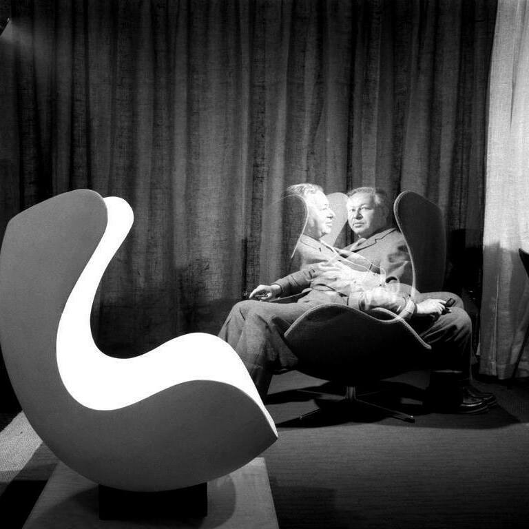 Крісла в формі половинок яєчної шкаралупи, затишно обіймають сидить, дизайнер розмістив в зонах лобі і ресепшен. До цього дня номер 606 готелю Radisson SAS Royal зберігає автентичну обстановку, створену Арне Якобсеном в 1960-х. Серед меблів від легенди датського дизайну: крісло-яйце, крісло-лебідь і крісло-крапля в оббивках кольору морської хвилі.