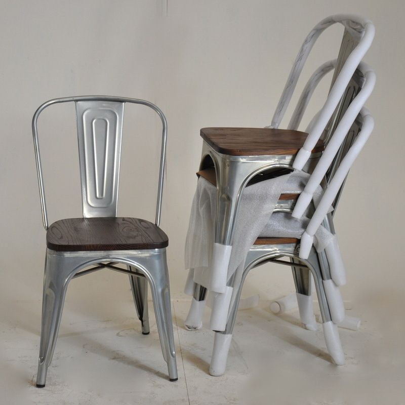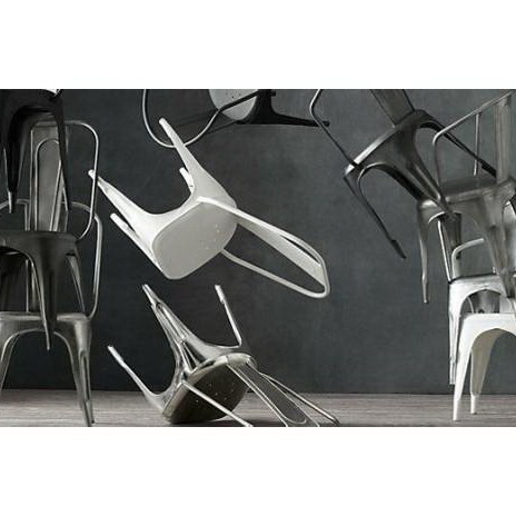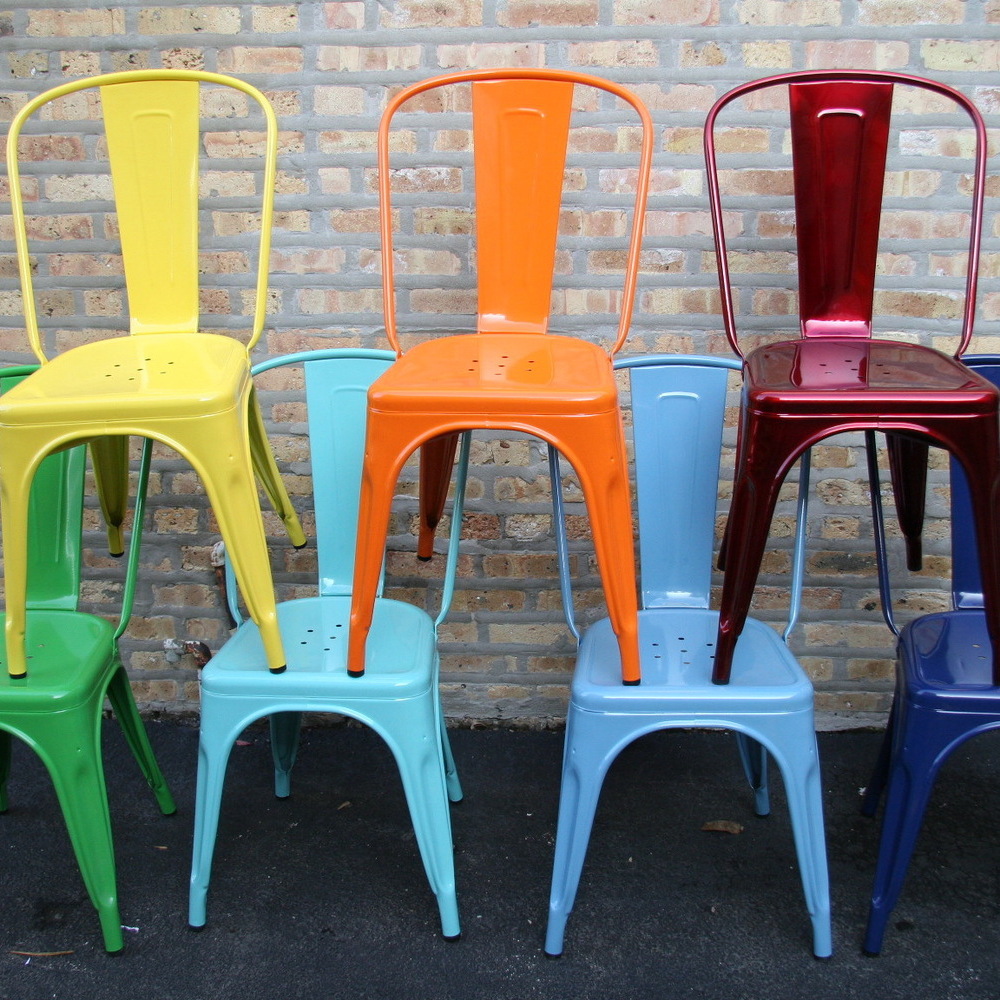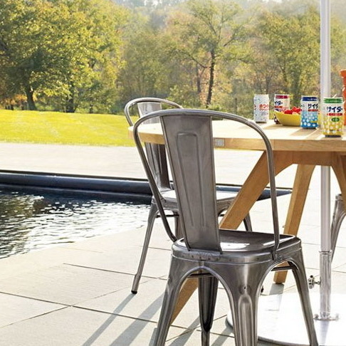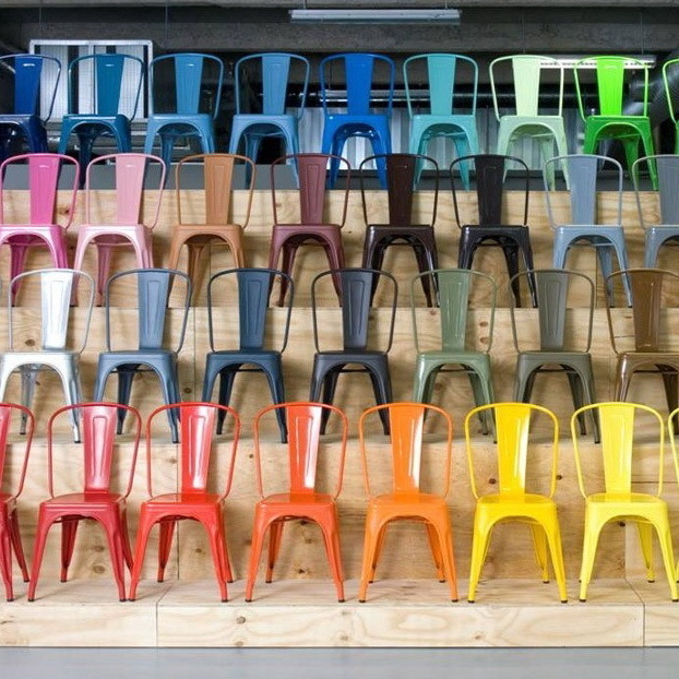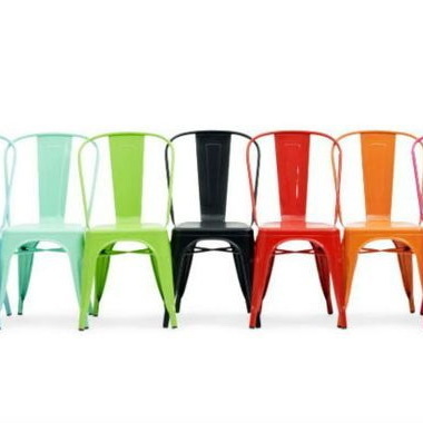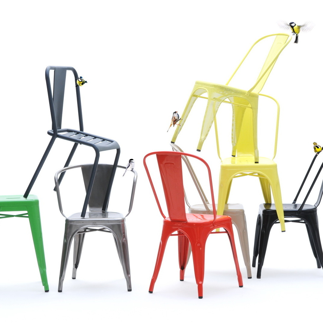 Стілець Tolix, відомий як модель «А», виготовлений з оцинкованого листового металу, завдяки чому він став стійкий до корозії.